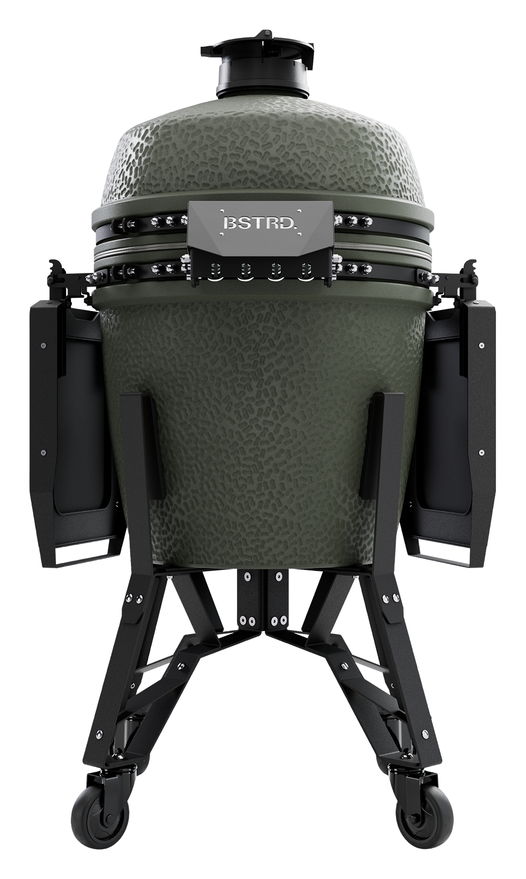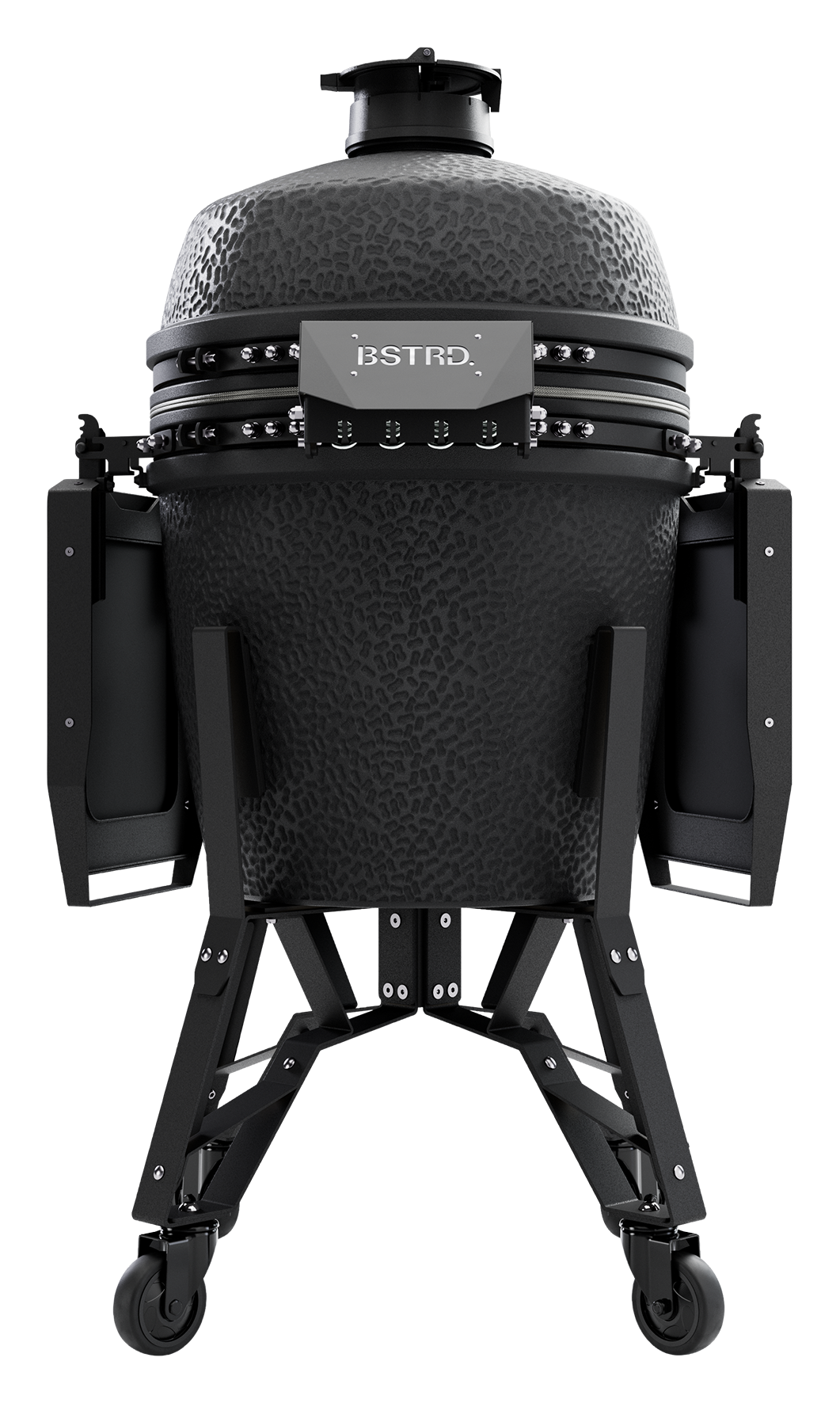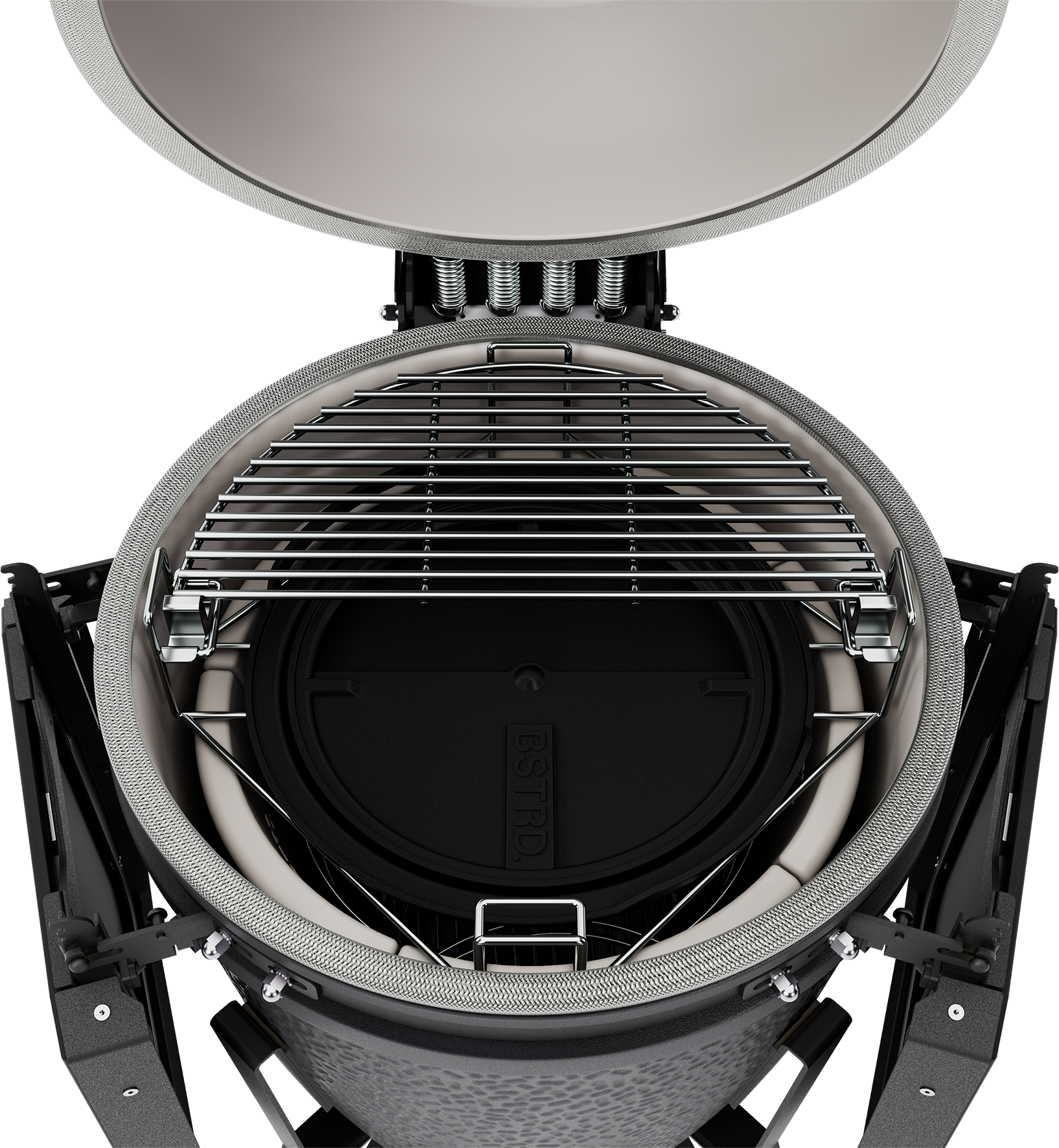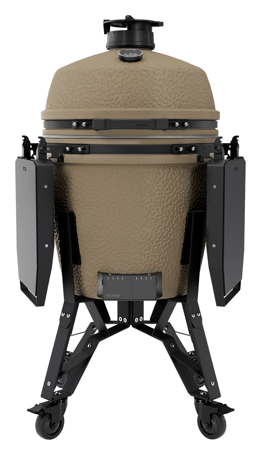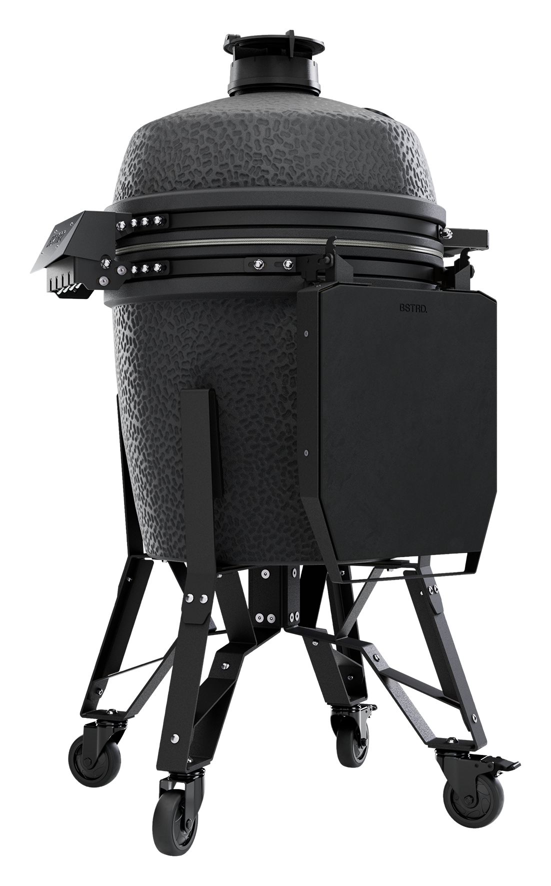 Der BSTRD. Keramikgrill Pro Large Complete ist ein Premium-Keramikgrill mit modernem Design und leistungsstarker Ausstattung. Das massive Gehäuse besteht aus hitzebeständiger Cordierit-Keramik und gewährleistet eine hervorragende Wärmeisolierung sowie eine gleichmässige Temperaturverteilung. Der Temperaturbereich von etwa 80 °C bis über 325 °C ermöglicht vielseitige Garmethoden wie direktes oder indirektes Grillieren, Niedrigtemperaturgaren, Räuchern oder Backen. Die PRO-Version ist mit einem Dynamic Twist Deflector aus Gusseisen ausgestattet, der einen schnellen Wechsel zwischen direktem und indirektem Grillen ermöglicht. Das präzise Gusseisen-Deckelventil mit Silikonschieber sowie der doppelte Lüftungsschieber sorgen für eine exakte Temperatursteuerung. Ein flach integriertes Deckelthermometer bietet klare Ablesbarkeit bei minimaler Kondensation. Das robuste Untergestell aus pulverbeschichtetem Stahl mit gummierten Schwerlastrollen gewährleistet Stabilität und Mobilität. Grosszügige Seitenablagen mit magnetischen HPL-Einsätzen erweitern die Arbeitsfläche und können bei Bedarf durch ein Schneidebrett ersetzt werden. Griff- und Scharnierelemente aus glasfaserverstärktem Nylon sorgen für komfortable Handhabung und hohe Langlebigkeit.