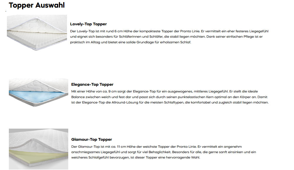 • Topper nach Wahl: Lovely (fest), Elegance (medium/atmungsaktiv), Glamour (weich/visco)