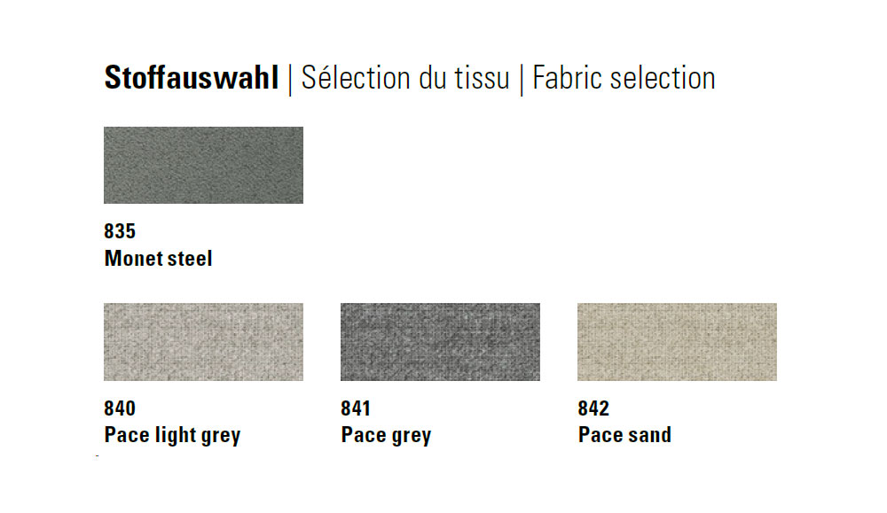 • Stoffvarianten: Monet steel, Pace light grey, Pace grey, Pace sand