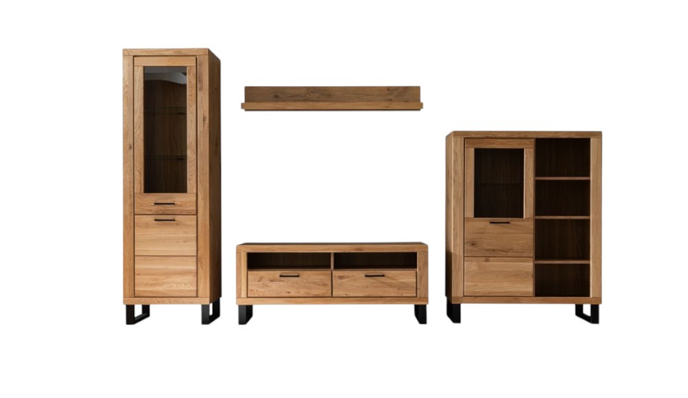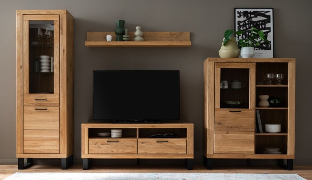 Die Wohnwand KAMBO W01 kombiniert massive Wildeiche-Fronten mit einem warmen, modernen Design. Die Anlage besteht aus einer Vitrine, einem TV-Element, einem Wandboard sowie einem Kombi-Highboard. Die Fronten sind aus geölter Wildeiche gefertigt, während der Korpus in Wildeiche-Nachbildung gehalten ist. Schwarze Metallgriffe und optionale LED-Glaskantenbeleuchtung runden das Gesamtbild ab.