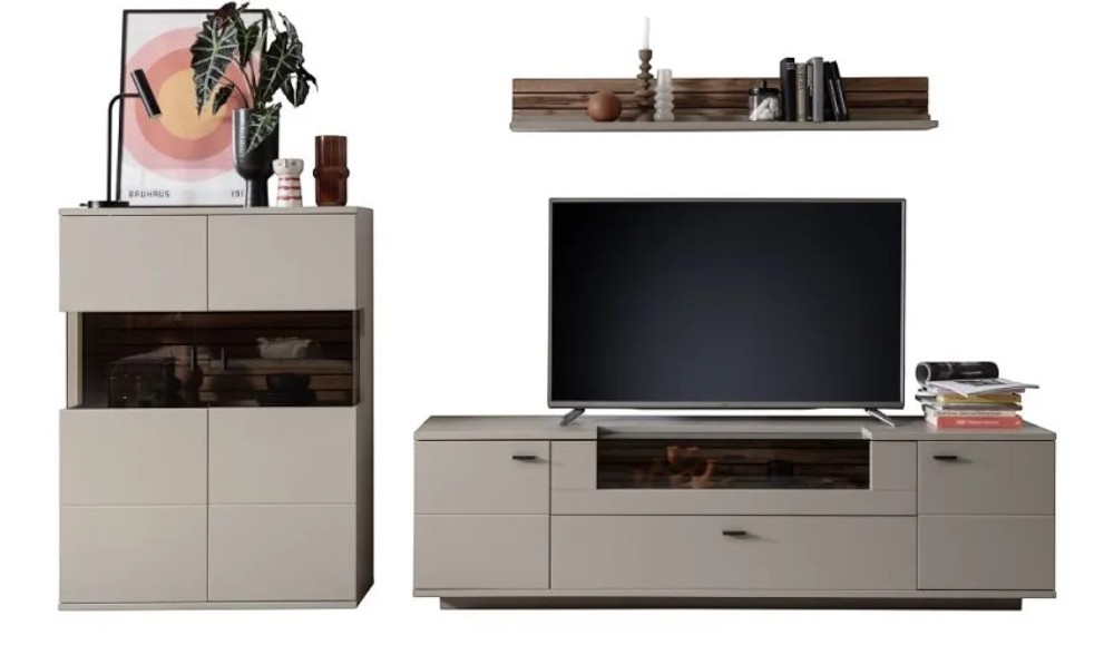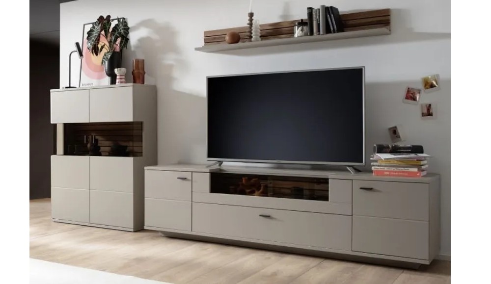 Moderne Wohnkombination bestehend aus TV-Unterschrank, Sideboard und Wandregal. , Front in Basalt und Wotan Eiche-Akzenten. Parsolbraunes Glas und anthrazit Metallgriffe - Optional Beleuchtung